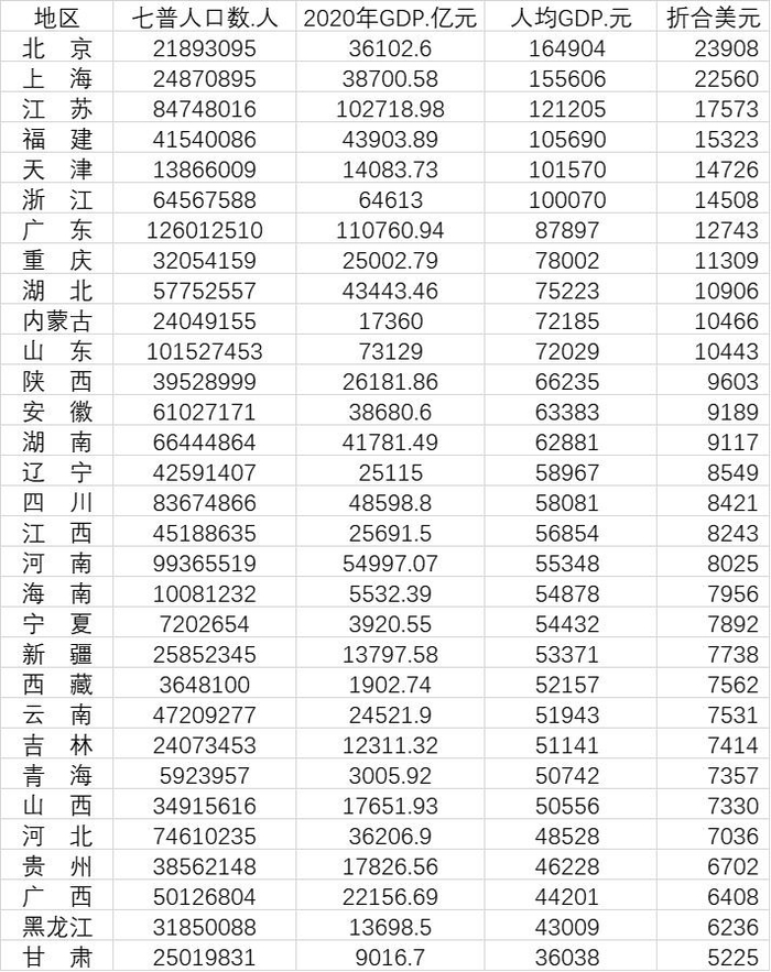 表:31省份人均GDP数据(第一财经记者七普数据和各地统计公报推算)