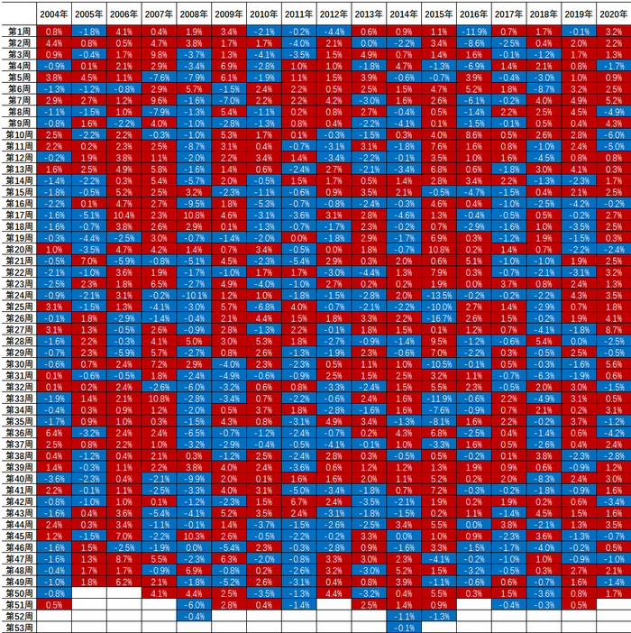 但是依据基金短期涨跌来进行择时仓位管理难度不小,中信证券在2004年至2020年逐周绘制了每日表现,其中上涨周用红色标注、下跌周用蓝色标注,按日来看,54%时间是上涨的;按周来看,56%时间是上涨的,想踏准红色方格,又完美躲过蓝色方格,非常折腾。
