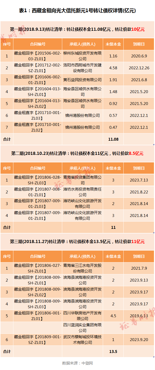 证券时报记者从中登网查询到的信息显示,光大信托新元1号分别在2018年9月13日、10月23日、11月27日,分三期受让了西藏金租持有的17笔债权,债权本金总额35.58亿元,光大信托支付总对价29.5亿元(表1)。