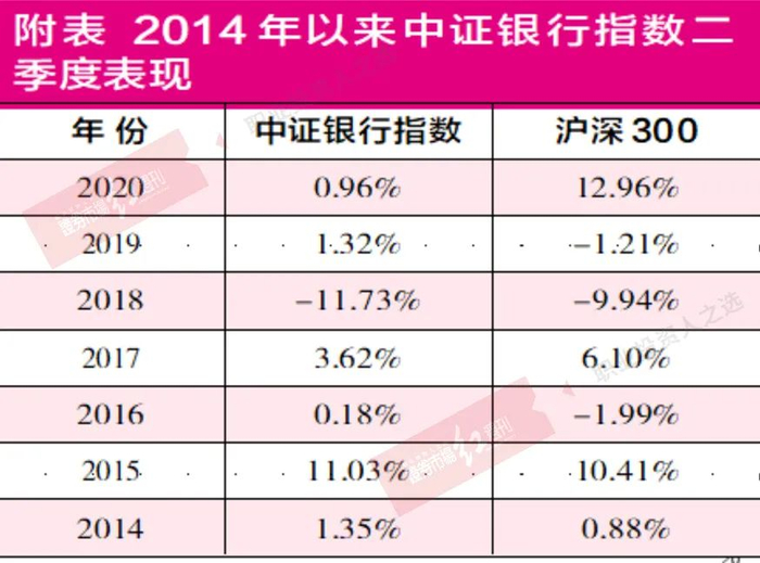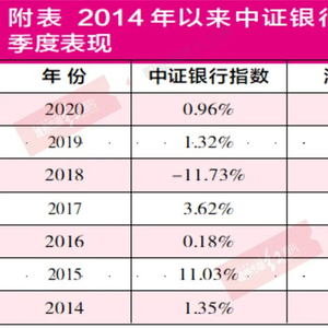 从近年来的情况看,每年的5-7月份是银行股实施分红的高峰期,这也容易形成所谓的“分红季”效应。从中证银行指数的走势来看,2014年以来二季度大多上涨,仅在2018年与大盘出现同步下跌,但当年7月份又出现领先大盘见底的走势。(见附表)“分红季”效应的背后,除了高股息的吸引之外,也有一些资金在一季度获利了结,需要进入一个体量较大、相对安全的板块进行阶段性投资,银行股可谓是这部分资金寻找“蓄水池”的最佳选择。