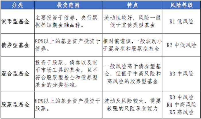 基金按照投资范围可分为以下四类,风险和收益由低到高:货币型→股票型。