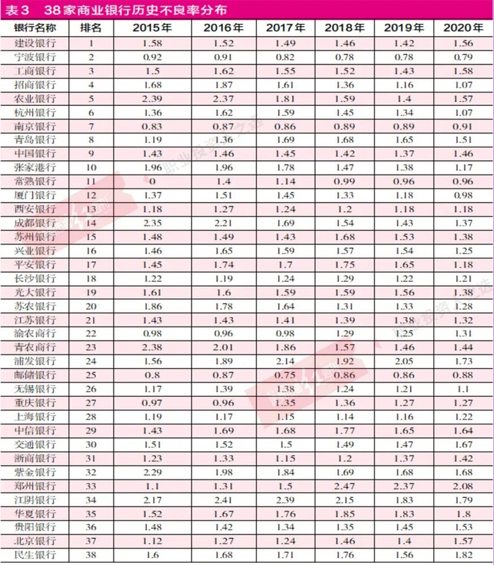 以宁波银行为例,其不良率很低,但是由于规模方面的原因,其在与建设银行的竞争中最终败下阵来,2020年的排名中屈居第二,相比2019年下降两个名次。
