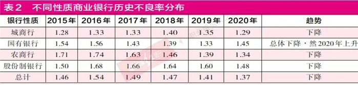 从中国银保监会公布的数据看,2020年,中国商业银行不良率1.84%,相比2019年小幅下降了两个BP,这个数据反映了全国商业银行的总体信用风险情况。从实际来看,目前全部上市商业银行36家,既有国有大行,有规模中等的股份行,也有规模较小的城商行与农村商业银行,这些银行规模大小不一,在不良率这一指标上也呈现分化特征明显。(见表2)