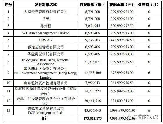 凯莱英:2020年10月12日,凯莱英披露了非公开发行股票发行情况报告书,非公开发行新增股份1017.87万股,募资金额23.11亿元,发行价格为227元每股,发行对象共有9家,其中高瓴获配440.53万股,获配金额约10亿元,为最大买家。