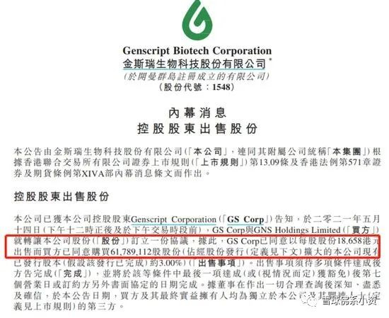 两纸公告,一则是金斯瑞发行新股,高瓴全部认购,持股5%,持有1.03亿股,认购价19.21亿港元。二则是金斯瑞控股股东出售3%的股份,出售6179万股,涉资11.53亿港元。认购完成后,高瓴持有金斯瑞1.65亿股,持股占比8%。