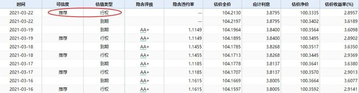 中债或中证因为未来存在行权或者不行权两种可能性,在实践中往往会给投资者两个估值收益率,分别为行权估值收益率和估值到期收益率,通过判断债券是否要行权对债券进行估值,并从中选择一个作为推荐收益率。