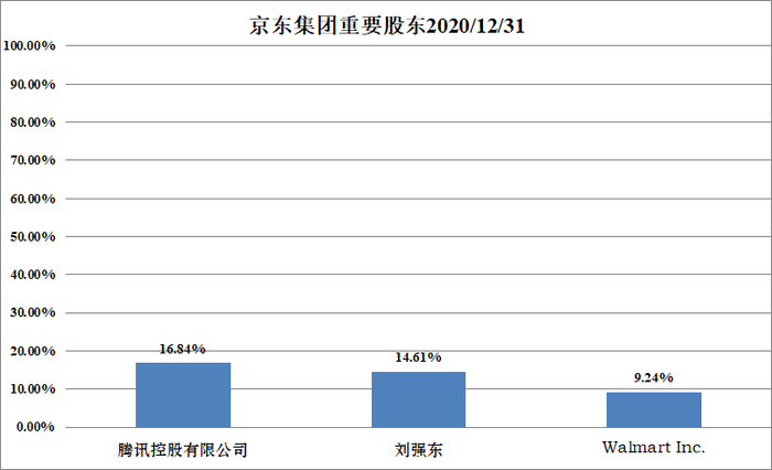 互联网巨头腾讯目前是京东最大的股东,自2014年3月起,与京东建立了长期战略合作关系,为京东提供支持与合作。截止2020.12.31,腾讯持有京东16.84%股份,沃尔玛持有京东9.24%股份。