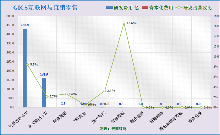 研发投入三甲:阿里巴巴430.8亿、京东集团161.5亿、阿里健康2.5亿。