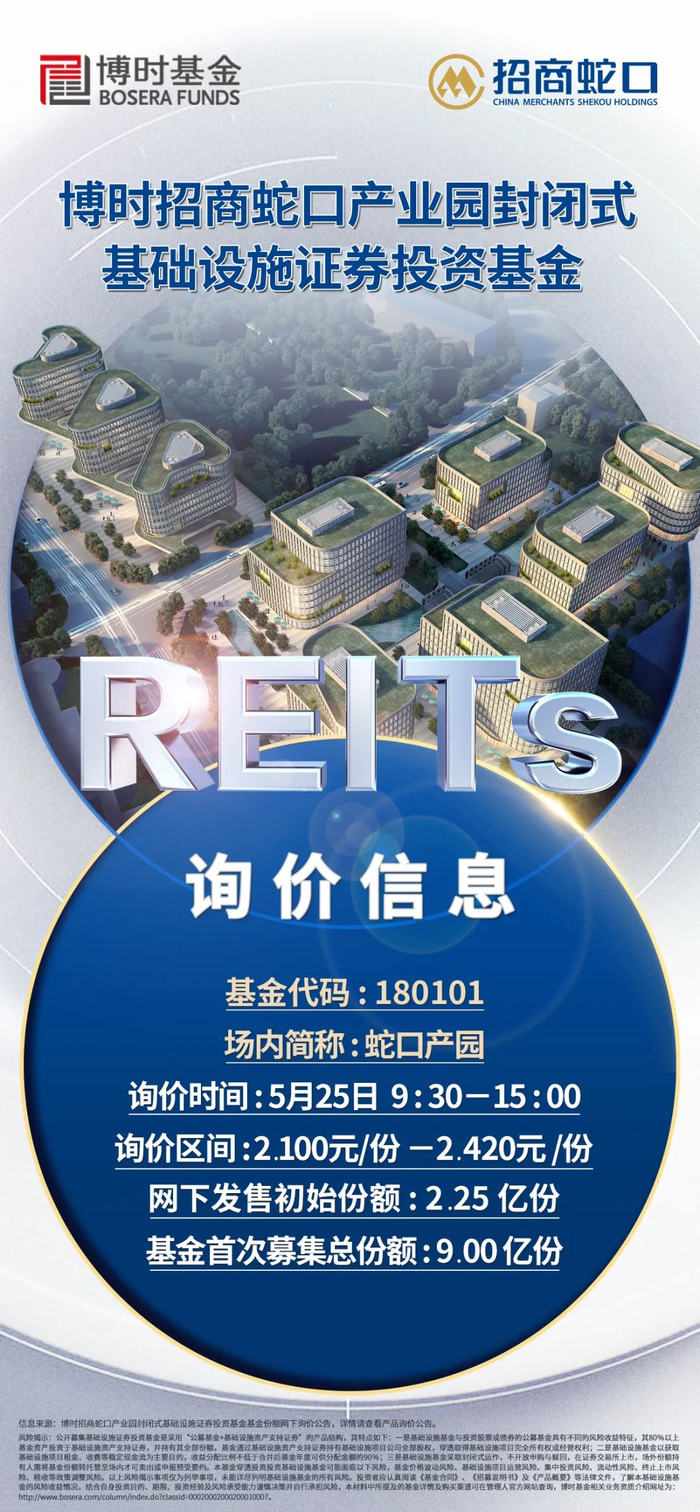 根据询价公告,招商证券担任本次发售阶段财务顾问即网下询价簿记管理人,招商蛇口产业园REITs将于5月25日进行询价,并将于近期开始基金份额发售及完成基金备案及设立。