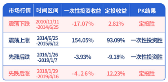在过去的十年中,普通股票型基金指数主要经历了震荡下跌、震荡上涨、先涨后跌和先跌后涨四种情况。通过小欧的研究发现,在震荡下跌、先跌后涨的行情下,定投效果更好。这是由于在市场下跌时,定投的平均成本不断摊低,即使亏损,幅度也小于一次性投资,而由于积累了大量便宜筹码,所以当市场反弹时,可以获得优于一次性投资的收益。