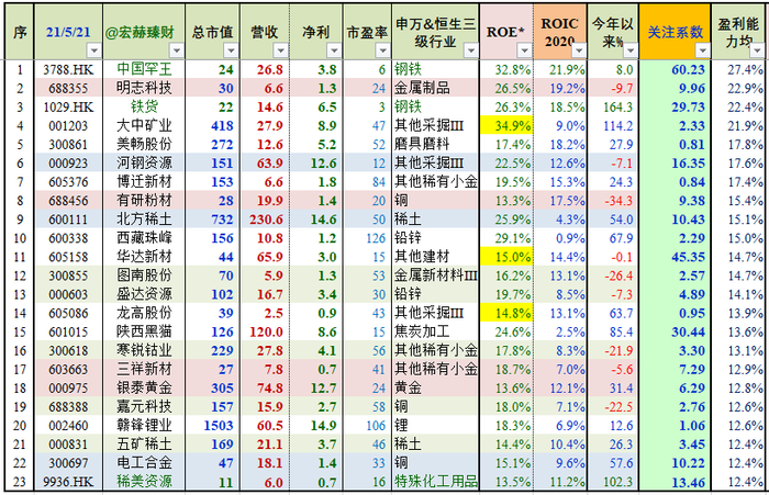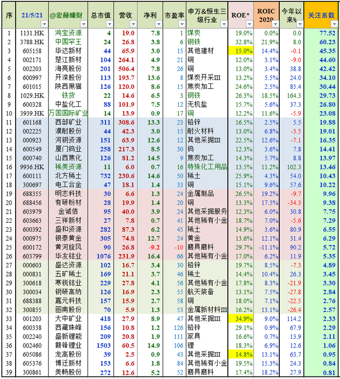 说明:排序按照宏赫臻财原创之关注系数排名,建议优先研究关注系数为5以上的个股,但此系数不构成投资建议。且不一定是越大越好。整体上看,5分以下居多说明该细分行业整体偏高估,资本市场喜欢给予溢价,5分以上居多,说明该细分行业整体偏低估,资本市场往往给予溢价性不强。(建议优先关注次序:①5-10分;②10-20分;③2.5-5分;④其他,回避两头极端值)