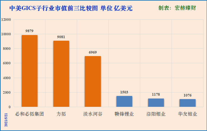 美股市值前三:必和必拓集团9879亿、力拓9081亿、淡水河谷6969亿人民币。