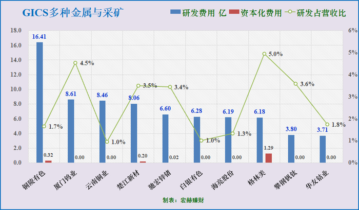 研发投入三甲:铜陵有色16.4亿、厦门钨业8.6亿、云南铜业8.5亿。
