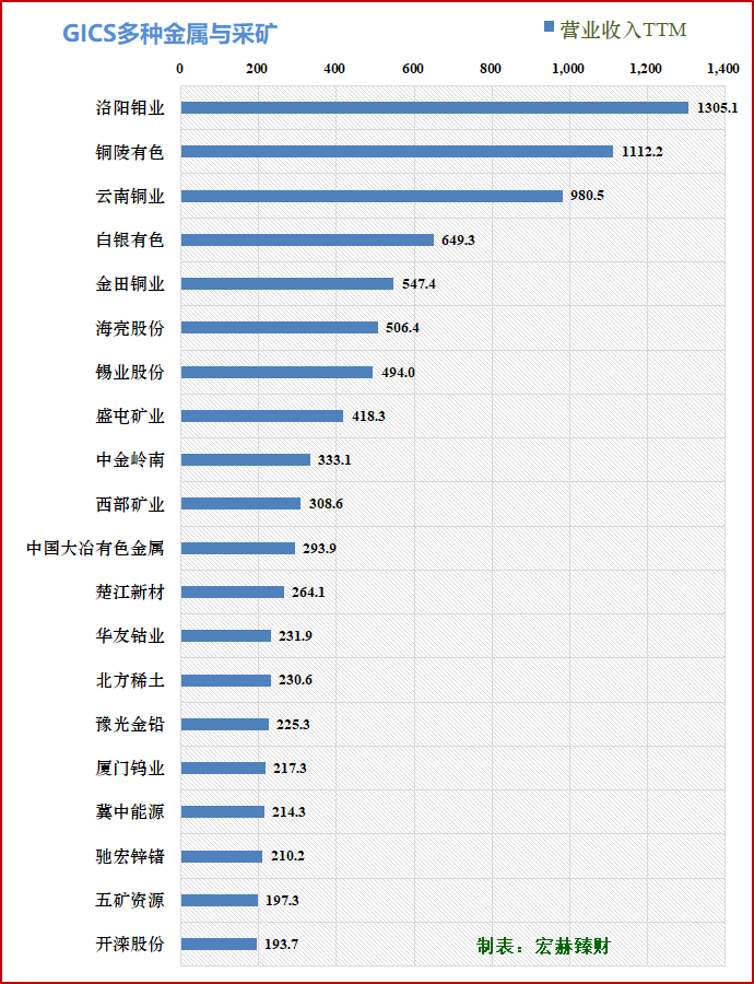 中股营收TOP3为:洛阳钼业1305.1亿、铜陵有色1112.2亿,云南铜业980.5亿人民币。