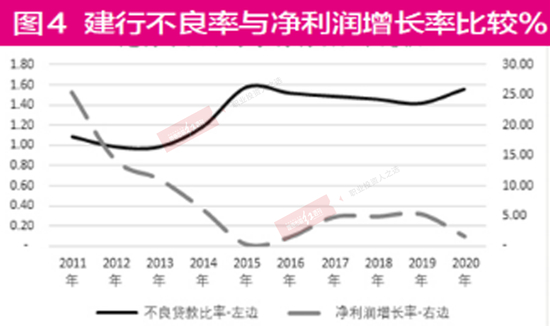 2012年,建设银行的业绩增速呈现断崖式下跌,当年其归母净利润增速14.13%,是2011年的一半多一点。此后,这家银行的业绩发展速度就开始明显下降了,整体维持个位数偏低的增速直到2020年,中间个别年度的业绩甚至是负增长,且中间伴随由于流动性收紧而导致的不良贷款率攀升。