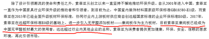 年报还相当霸气地表示:“索菲亚康纯板已经成为中国无甲醛板材的最大使用者,远远超过行业内其他企业的总和”。