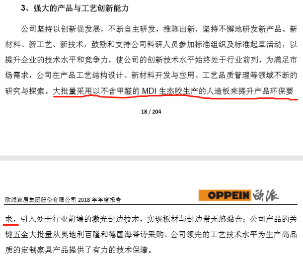 而反观欧派的年报,气场就弱多了。由于2019年报未出,我们翻开2018年报,在描述产品竞争力的那个段落里,公司只是淡淡地讲了句“大批量采用以不含甲醛的MDI生态胶水生产的生态板来提升产品环保要求”,既没有强调自主性的研发,也没有给出硬核性的数据。