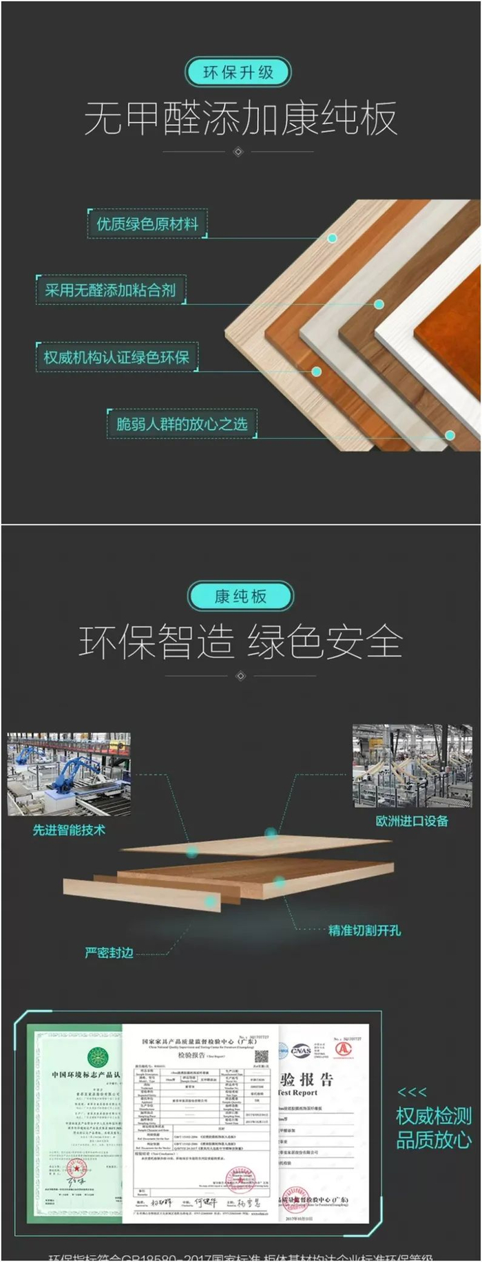 两家天猫旗舰店的产品详情页对比同样强烈,索菲亚非常显眼地给出了康纯板和E0板关于绿色环保的配图介绍,而在欧派的旗舰店,我点开了好几个产品,上上下下仔细打量,都没找到任何关于环保的说法。