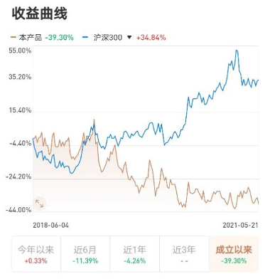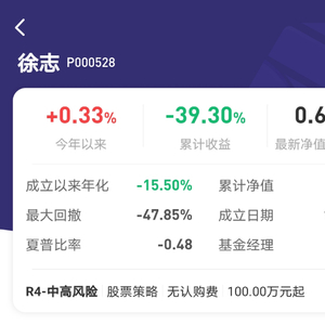 资料显示,徐志私募证券投资基金成立于2018年6月4日,截至2021年5月21日,单位净值0.6070元,今年以来收益率0.33%,近一年亏损4.26%,总收益为-39.30%,成立以来年化收益率-15.50%。若投资者在成立时买入这只基金,100万元将只剩下61万元。