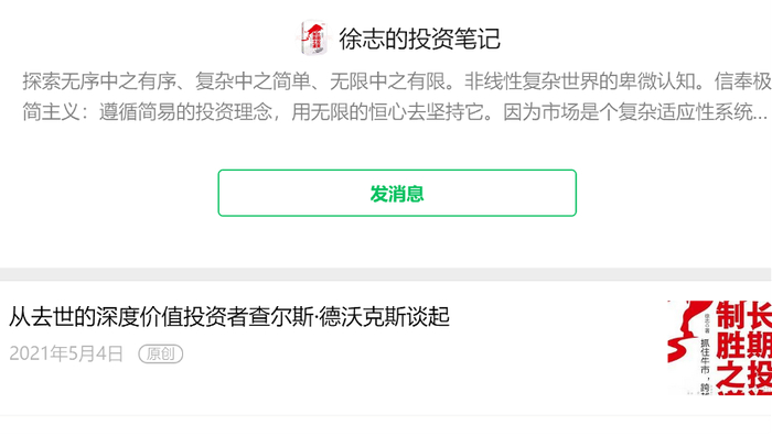 5月4日,徐志的微信公众号发布了《从去世的深度价值投资者查尔斯·德沃克斯谈起》一文。文中提到,“对于我来讲,基金生涯初期的不顺,反倒提供了足够的经验,这三年是前无古人后无来者的三年,未来恐怕再也遇不到风格如此分化的市场了,对于我来讲,这是一笔丰厚的财富。价值王者的时代可能正归来!”