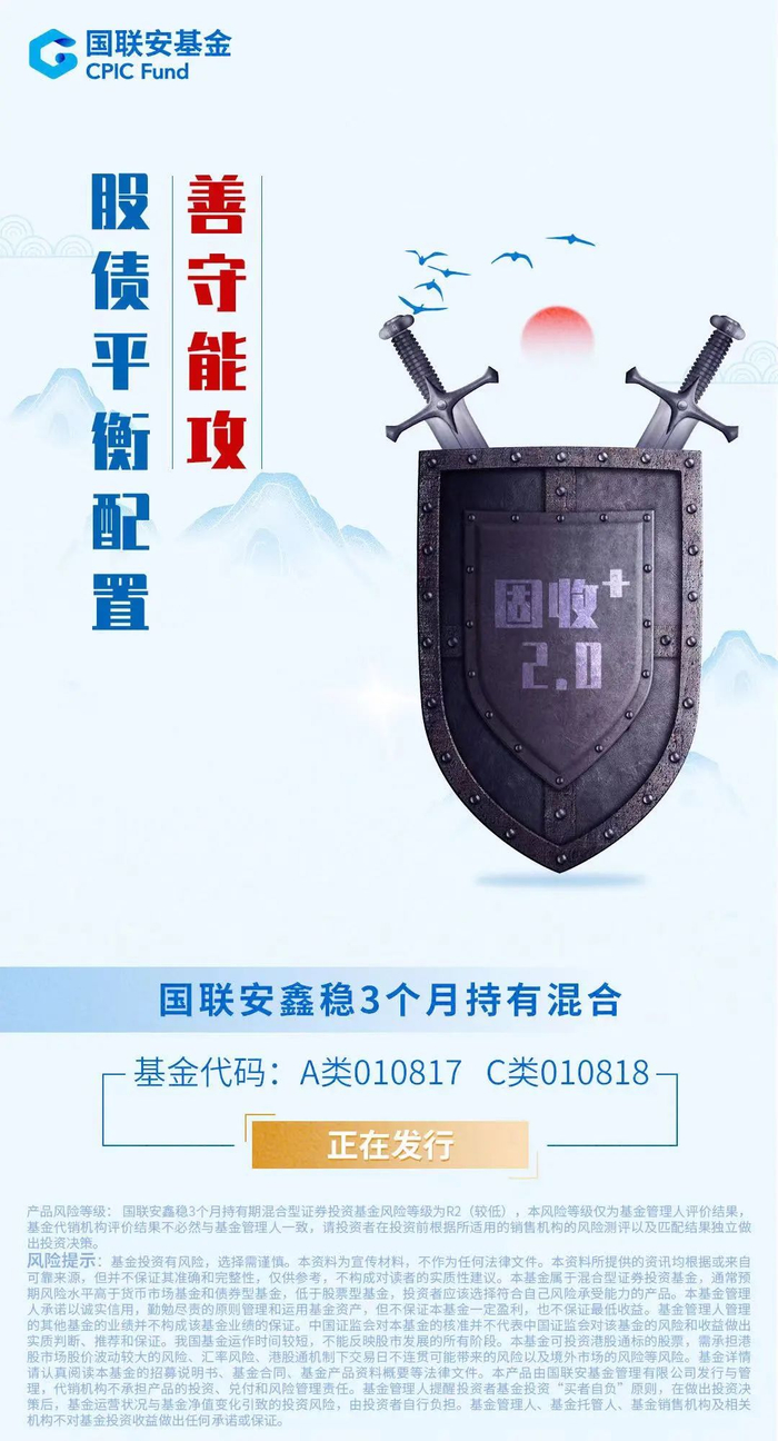 产品风险等级: 国联安鑫稳3个月持有期混合型证券投资基金、国联安鑫隆混合型证券投资基金、国联安鑫乾混合型证券投资基金、国联安鑫发混合型证券投资基金、国联安鑫汇混合型证券投资基金风险等级为R2(较低),本风险等级仅为基金管理人评价结果,基金代销机构评价结果不必然与基金管理人一致,请投资者在投资前根据所适用的销售机构的风险测评以及匹配结果独立做出投资决策。