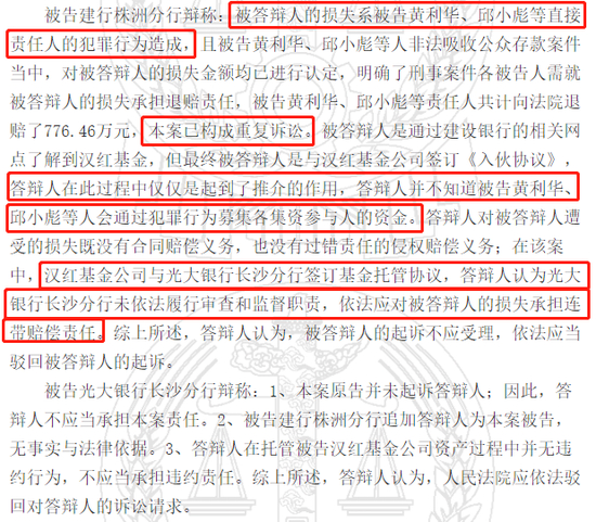 因光大银行长沙分行为汉红基金的基金托管人,判决书中中信银行长沙分行也牵涉案件当中。于是,建行的受害客户们将建行株洲市分行、光大银行长沙分行等一同以被告身份告上法庭,要求承担连带责任。