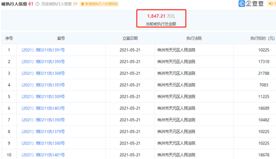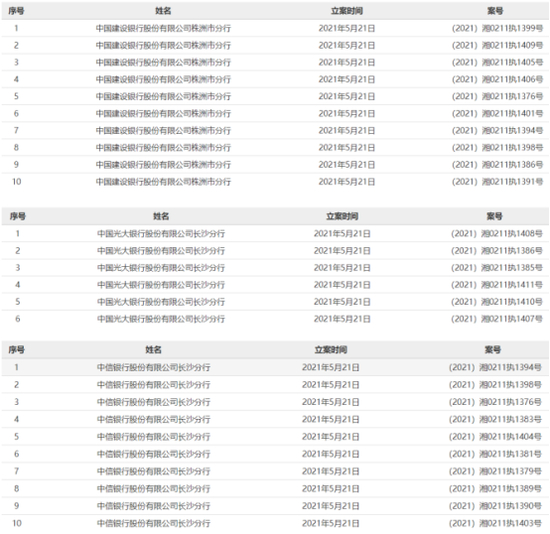 日前,据中国执行信息公开网显示,中国建设银行株洲分行、光大银行长沙分行、中信银行长沙分行等三家银行一天新增数十条被执行人信息,执行案件的立案时间均为2021年5月21日,执行法院都是株洲市天元区人民法院。