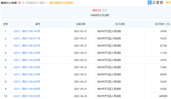 光大银行长沙分行有18条,立案时间为5月21日的有9条,4月25日的有9条。合计执行标的金额为484.21万元。
