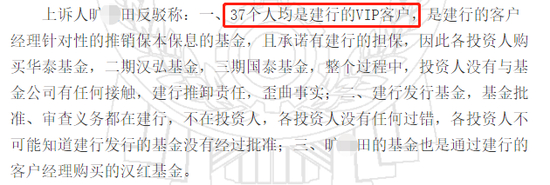 同时,据旷某田在二审中的辩词显示,跟其有同样遭遇的有37人,均是建行vip客户,建行的客户经理针对性推销这类保本保息的基金,且承诺有建行的担保,因此各投资人购买华泰基金,汉红基金等。整个过程中,投资人没有与基金公司有任何接触,与汉红或华泰所签协议全部由建行株洲分行及各支行客户经理一手办理。