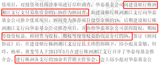2013年,在建行株洲分行原行长戴建军及湘江支行行长王炜等人对华泰基金进行考察后,建行株洲湘江支行便与华泰基金签订了《顾问协议》。