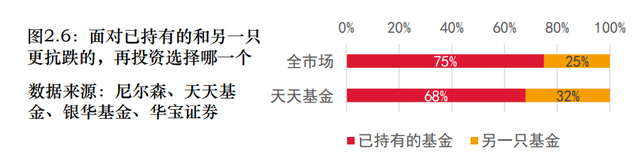 假设有两只主题相同的基金,其中一只投资者已经持有,但这只基金的跌幅大于另一只投资者未持有的基金。如果投资者可以再投资其中一个,会做什么样的选择?参与调研的投资者中,有70%的人选择了继续加仓已经持有的基金,而放弃投资弹性更强的另一只,原因是“稀释成本”。