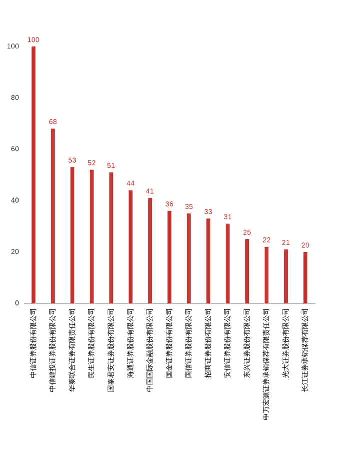 保荐机构方面,保荐企业数量最多的券商是中信证券股份有限公司 ,共计100 家;排在第二位的是中信建投证券股份有限公司 ,共计68家;华泰联合证券有限责任公司 排在第三位,共计53 家。