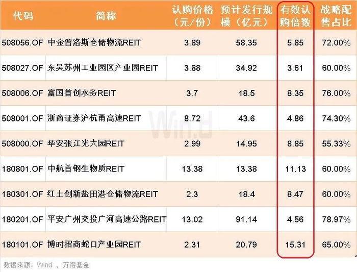 Wind数据显示,这9只公募REITs平均战略配售比例为66.8%,平均有效认购倍数近8倍,预计共募集资金314.02亿元。