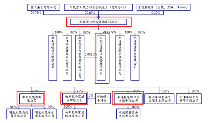 并购过程中夹杂着繁复的股权出售以及重新资本架构,最终形成了丰联酒业控股安徽文王贡酒股份有限公司,并通过安徽文王贡酒控股湖南武陵酒、山东孔府家以及河北乾隆醉的股权架构(下图)。从公司名称来看,不排除彼时的丰联酒业打算以安徽文王贡酒为主体IPO上市的可能。