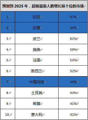 未来五年,莱坊预计全球超高净值人士数量将增长27%,而高净值人士的数量预计将增长41%。莱坊预测,2025年全球超高净值人士数量将达663,483人。亚洲超高净值人士的人数将增加39%, 其中印尼(67%)、印度(63%),中国内地(46%)的增幅名列前茅。