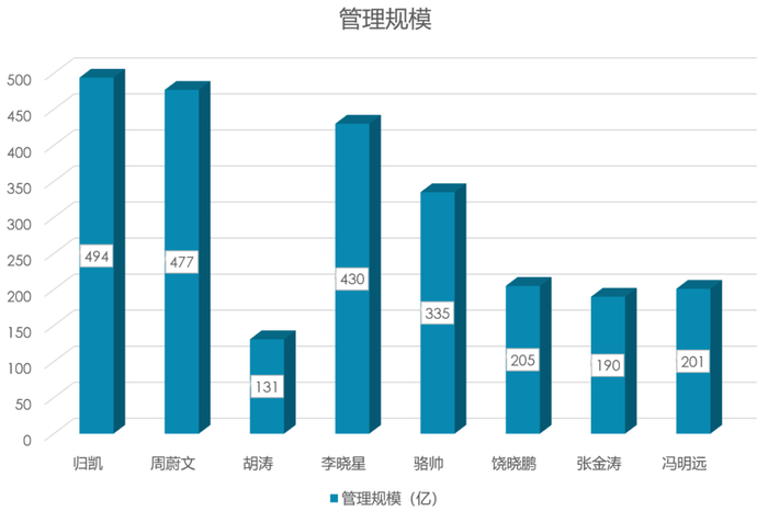 截至去年底,归凯、周蔚文、李晓星的基金管理规模超过四百亿。