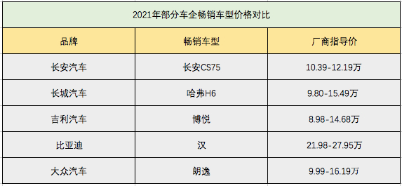 从最畅销车型的价格来看,国产汽车已经摸到了合资车企的门槛。目前上汽大众最畅销车型朗逸的官方指导价为9.99-16.19万,相较长安、吉利等国有车企,并没有明显优势,而比亚迪今年最畅销车型,汉的厂商指导价更是高达21.98-27.95万元,已明显超过合资品牌一个档次。