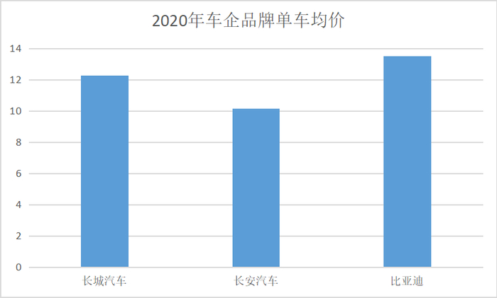 不过,品牌向上,不仅仅是打造一款高端车这么简单。比起旗下有多么高端的车型,消费者愿意为这个品牌花多少钱,更能反映品牌高度,也就是所谓的单车均价。国信证券根据乘联会口径进行测算,2020年长城汽车的单车均价为12.28万元,长安汽车的单车均价为 10.14万元,比亚迪则为13.52万元。