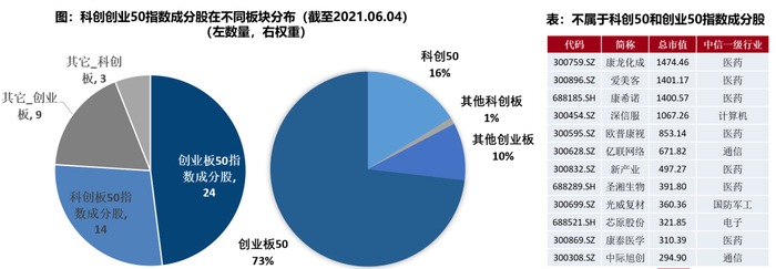 另外,最近大热的指数就是中证科创创业50指数。科创创业50指数成分股不是创业板50和科创板50指数成分股的子集:科创创业50指数成分股中属于创业板的个股有33只,属于科创板的个股有17只;其中有12只成分股既不属于创业板50指数成分股也不属于科创板50指数成分股,体现了科创创业50指数的独特性。