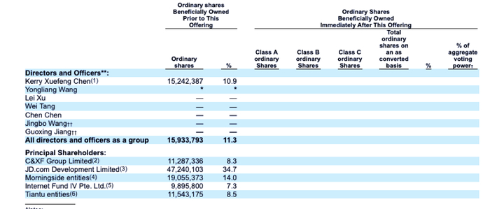 根据招股书,IPO前,京东持股34.7%,为公司最大股东,五源资本持股14%,天图资本持股8.5%,老虎环球基金持股7.3%。