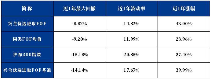 兴全优选进取三个月持有混合FOF(基金代码:008145)就是一只权益类FOF,历史数据显示,它较好地平衡了收益与波动:近1年最大回撤仅-8.82%,而近1年沪深300指数的最大回撤为-15.18%,业绩比较基准的最大回撤为-14.14%,体现了主动管理能力。