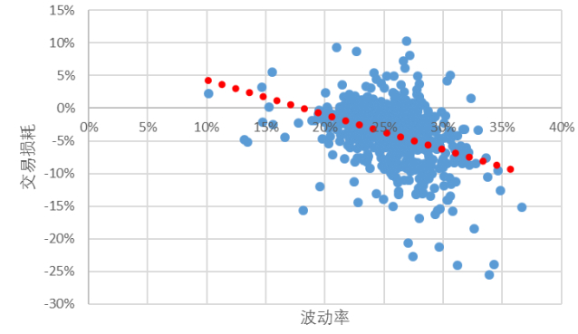 基金波动率也是一样的道理。我们做过统计,从基金定期报告的“基金利润”中,可以计算出“基金赚钱、基民不赚钱”二者之间的差异,我们将其称之为“交易损耗”。统计发现:波动率越高的基金,交易损耗也越高,即低波动基金的持有体验更好。