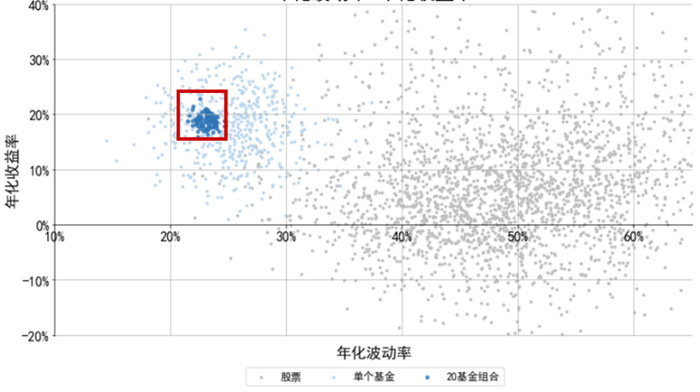 数据来源:天相投资分析系统、兴证全球基金FOF投资与金融工程部;统计时间:2013/7/17-2020/7/17,使用周频数据;抽样基金为已成立的偏股开放基金,共509只;灰点表示单个股票,浅蓝色点表示偏股开放基金,深蓝色点表示随机选择20只基金构成的投资组合,共100组。历史数据不代表未来表现和收益承诺,基金投资需谨慎。