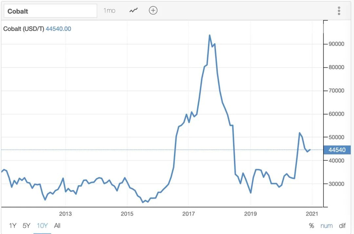 其中,钴金属大部分分布在刚果(金),因为长年战乱,供给极不稳定,价格波动剧烈,很多电池厂商一直在想办法降低钴含量,包括特斯拉和长城旗下的丰巢能源都喊出“无钴电池”,钴的价格也从2018年上半年的9万美元/吨下降至现在的4.45万美元左右,近乎腰斩。