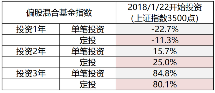 以最近一次上证指数3500点的位置为例,如果我们在2018年1月22日开始投资偏股混合型基金,三年后最终的收益率与一次性投资几乎相同,而整个过程中投资体验明显优于一次性投资。可见,对于普通投资者而言,基金定投是达成长期投资目标的优选方式,也是应对震荡市场的一剂良方。