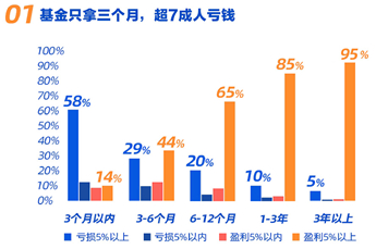 从基民收益的角度来看,3年也是比较接近中长期获取正收益的合理期限。根据支付宝《一季度基民报告》显示,基民赚钱比例与持仓时间显著正相关,随着持有时间的不断延长,投资者盈利的比例不断提升。以支付宝金选近一百只基金产品为例,持有基金时长在3个月以内的用户,超7成都是亏损的,当持有时间在3年以上时,有95%的投资者盈利5%以上。