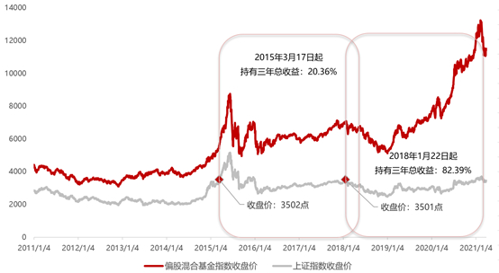 为了回答这个问题,东方小红以偏股混合型基金指数(885001.WI)为例,追溯过去10年间上证指数达到3500点附近的位置,统计从当时开始持有偏股混合型基金指数三年后的收益情况。如下图显示,在上证指数3500点位置开始投资偏股混合型基金指数,基本上都能取得不错的正收益。虽然三年间不乏有一些波折,投资者很难确保在买入后立马盈利,但只要“长期在场、长期投资、长期持有”,最终都能实现长期投资的成功。