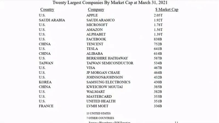 2021年3月31日,我按照市值筛选出了全世界最大的20家公司。各位可能对其中的绝大多数公司都很熟悉。