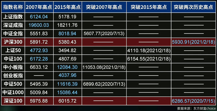 我们统计了11只A股主要宽基指数,截至2021年6月22日,只有深证100指数和沪深300指数,在本轮行情中超越了2007年和2015年高点,创出历史新高。