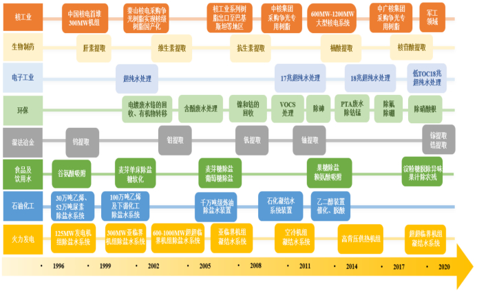 得益于人们对生活品质要求的提升,和各种工业产品精度要求的提高,离子交换与吸附树脂已经从火电、热电、石化等传统行业,拓展到食品、核电、电子、生物医药、环境保护、冶金等诸多领域。这些国家重点发展新兴产业或国民经济重要产业的不断扩张,使得上游离子交换与吸附树脂需求也逐年增长。